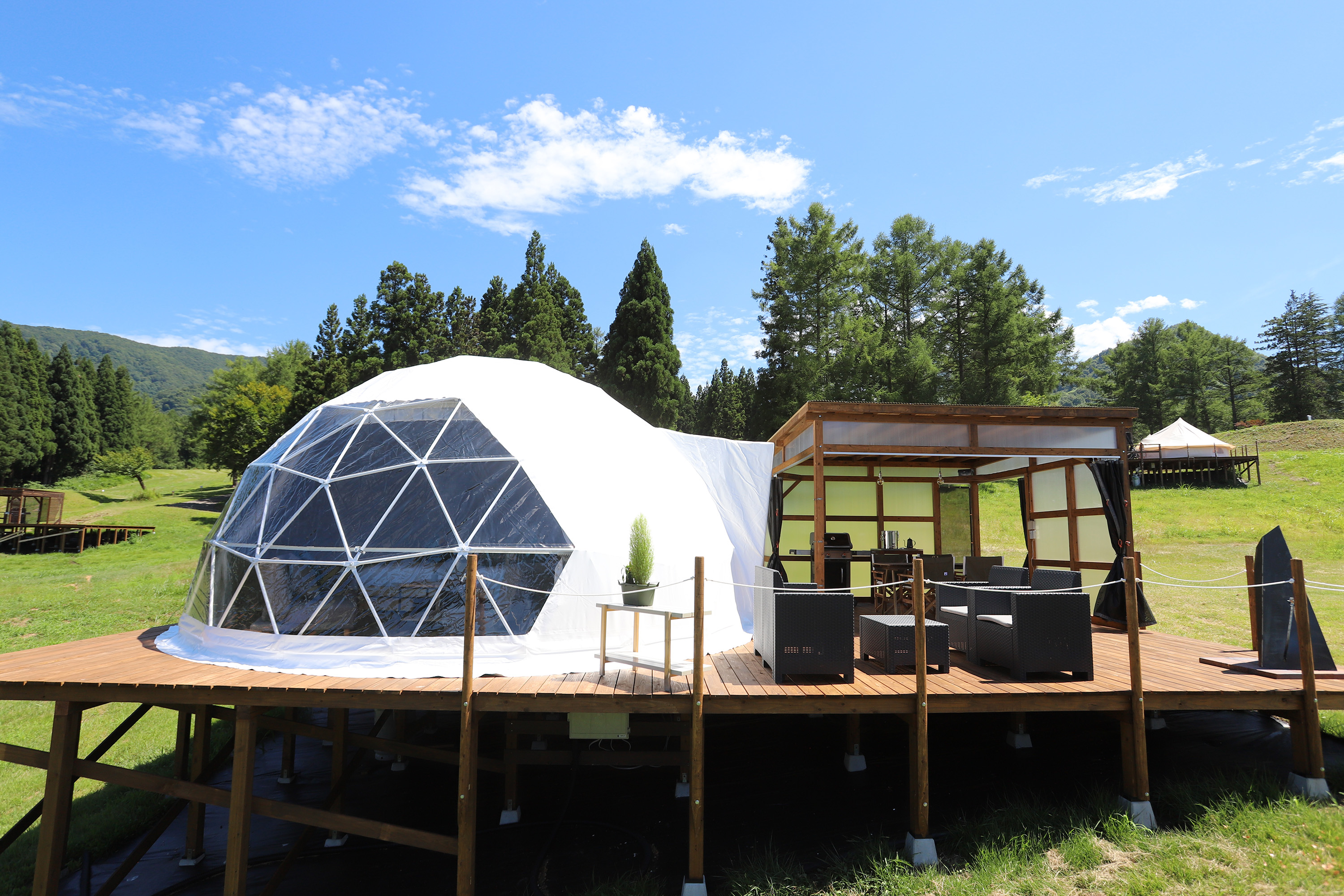 魚沼平野が一望できる抜群の眺望と、広々とした天然芝のサイトが自慢のグランピング施設は、見晴らしの良い山間に点在するテントにベッドが置かれておりまるでホテルの部屋のよう。アウトドアリビングが付いた常設大型テントで、至れり尽くせりの贅沢キャンプが楽しめます。