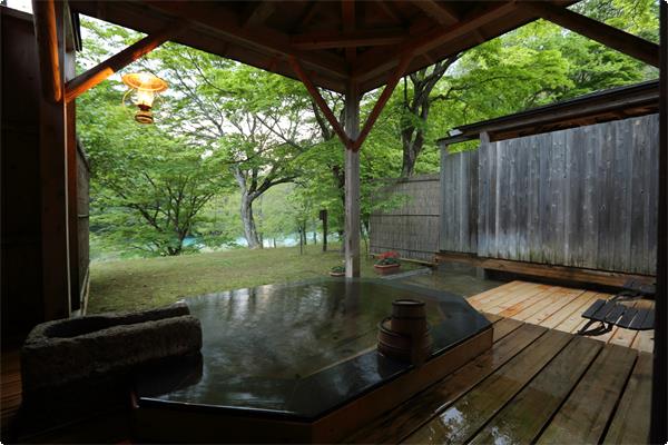 部屋の前には専用露天風呂、景観の良い和室とテンピュールマットの寝室。秘湯の快適さを追及した特別室で、露天風呂や部屋からは自然公園抱返り渓谷の流れや新緑と山桜、紅葉、雪景色が楽しめます。